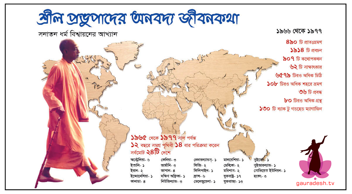 ¤ ১৯৭৭: ১৯৭৭ সালের ১৪ নভেম্বর এই ধরাধাম থেকে অপ্রকট হওয়ার পূর্বে শ্রীল প্রভুপাদ সমগ্র জগতের কাছে ভগবানের বাণী পৌঁছে দেবার জন্য তাঁর বৃদ্ধাবস্থাতেও সমগ্র পৃথিবী চৌদ্দবার পরিক্রমা করেন।
